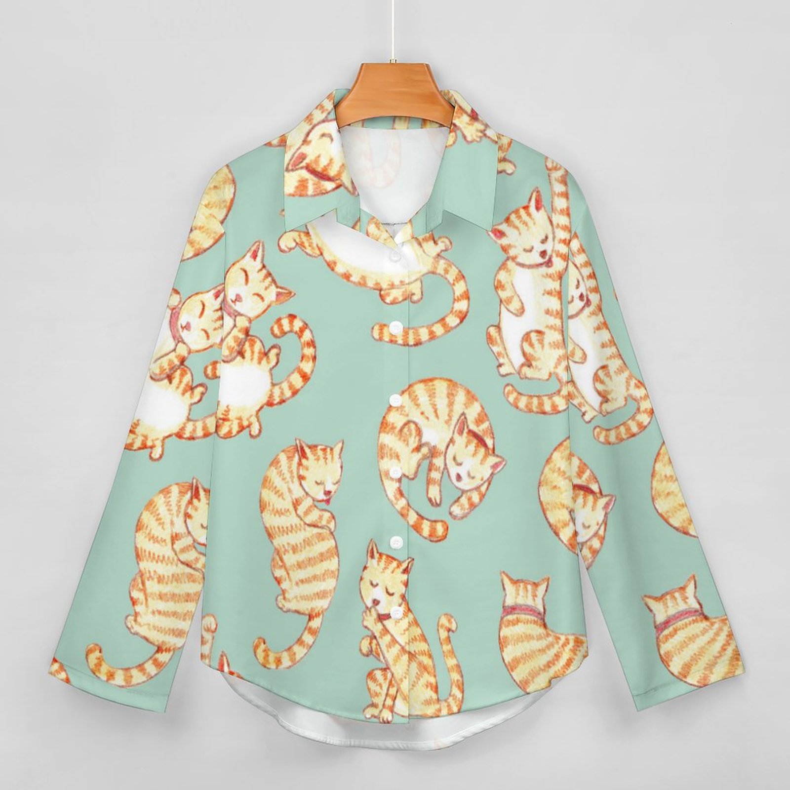 Orange Tabby Cats Illustrated Button Down V Neck Shirts Long Sleeve Blouse Roll Up Cuffed Sleeve Casual Shirt Tops