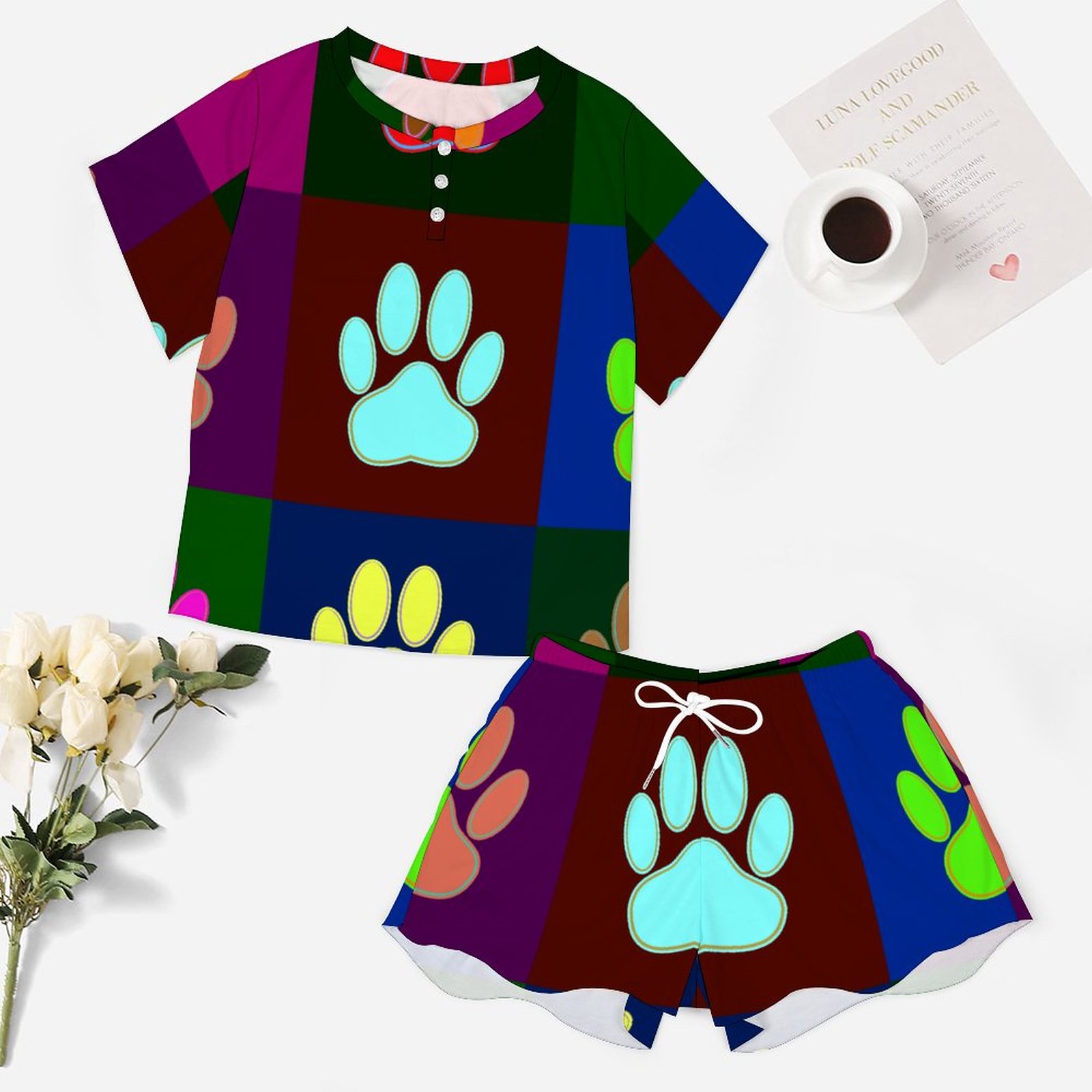 Multicolored Dog Paw Print Women Short Sleeve Tops and Shorts Pajama Sets Casual Two Piece Sleepwear Plus Size Pj Sets